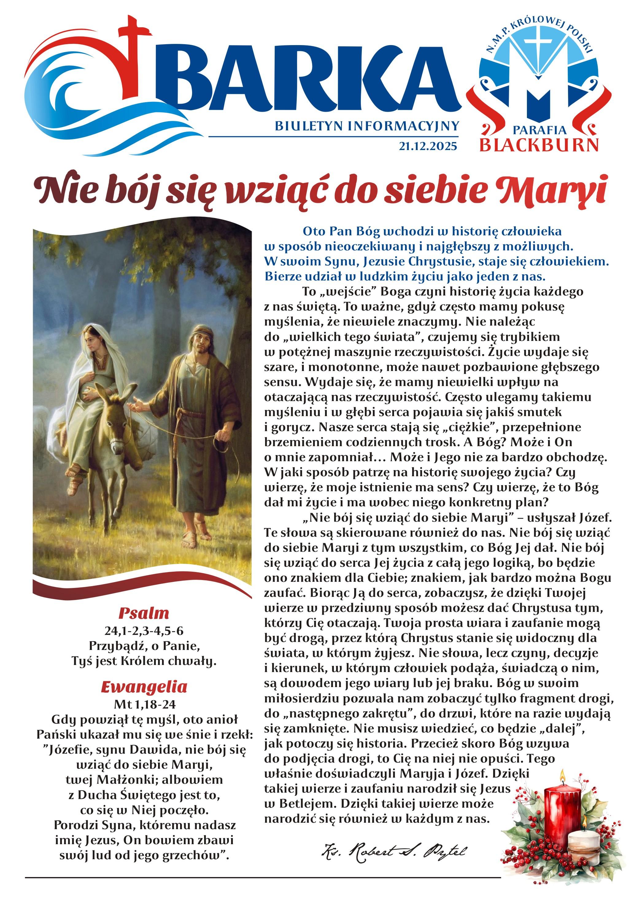 poniedziałek 06:30RORATY 1. W intencji Kacpra Aleksandrzak . 2. W intencji Ireny i Mariana Dobosz z okazji 51 rocznicy ślubu.